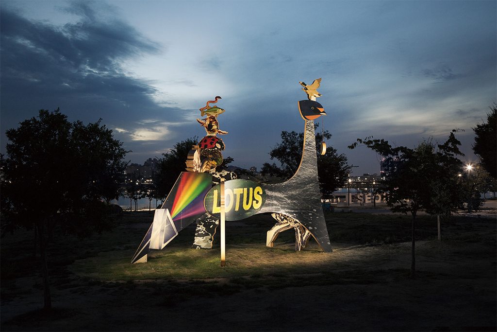 2018, New Structure – Hangang 06 New StructurePosted on:2018/10/032020/04/14 New Structure – Hangang, 2018, Print on wood, Varnish, Steel, Urethane,Gold Leaf 700x550x780cm